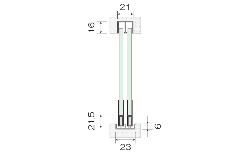 厚み5mmガラス用ハカマ付き引戸で堀込式のプランです。コレクションケースやお店の什器、ショーケース等幅広い用途で使用可能。このプランは堀込式のため溝にレールが納まり見栄えも良いので、新築やリフォーム、オーダーメイドの家具などに適しています。